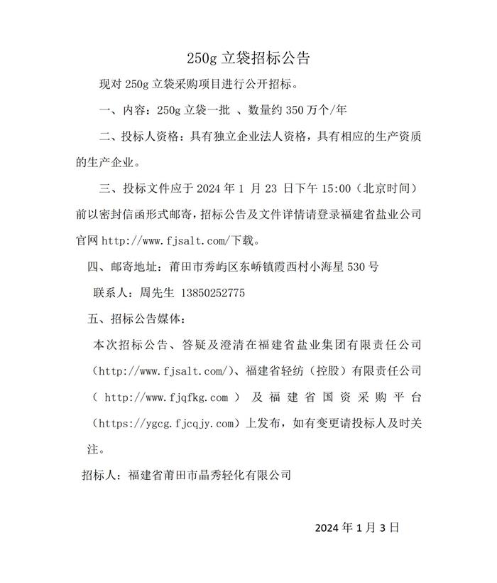 晶秀輕化250g立袋采購(gòu)項(xiàng)目招標(biāo)公告