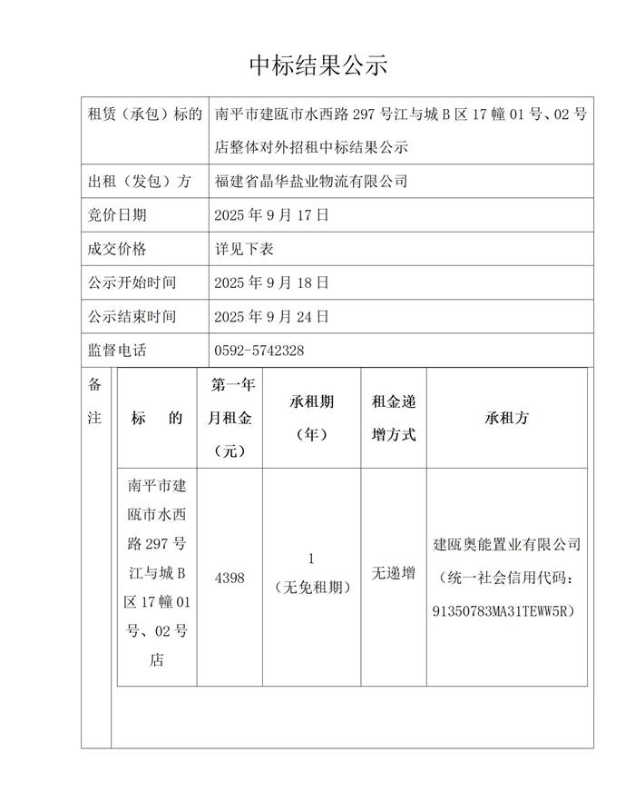 南平市建甌市水西路297號江與城B區(qū)17幢01號、02號店整體對外招租中標結果公示