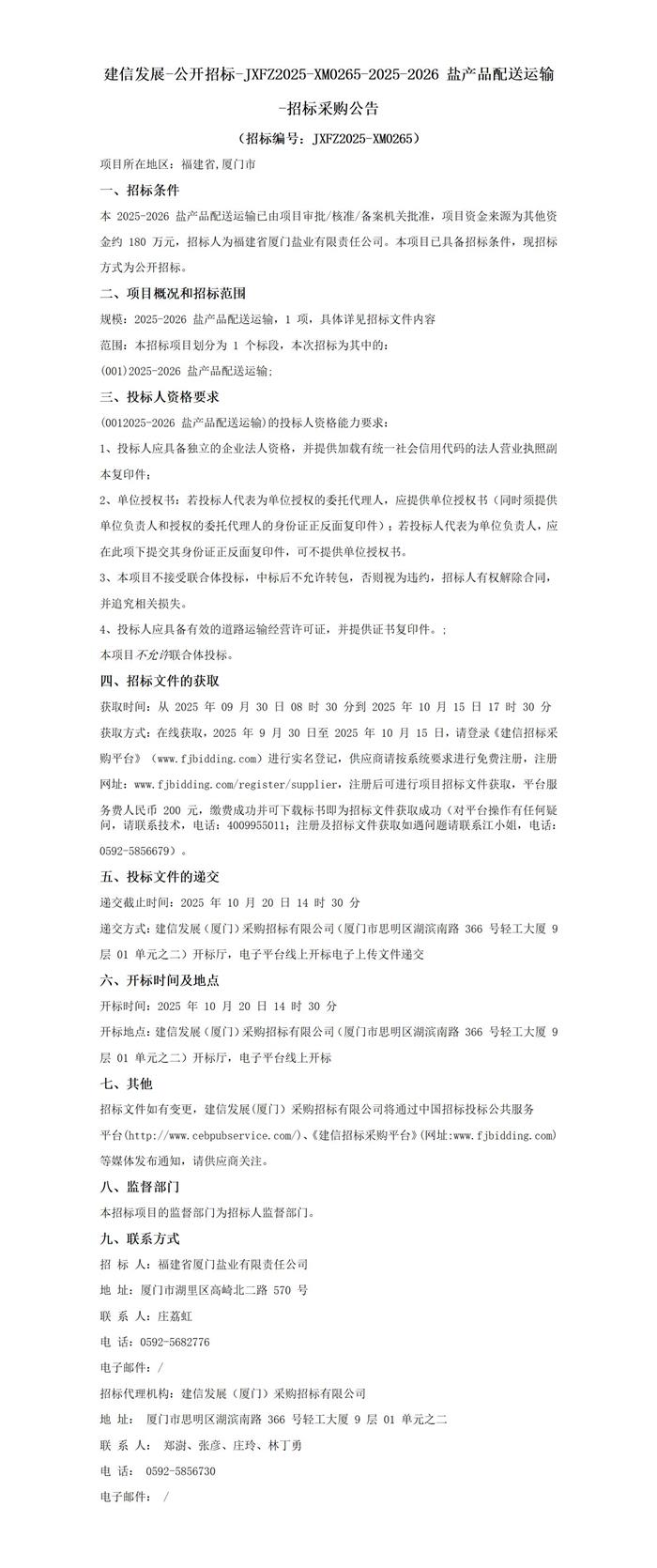 福建省廈門鹽業(yè)有限責(zé)任公司2025-2026鹽產(chǎn)品配送運(yùn)輸招標(biāo)采購公告