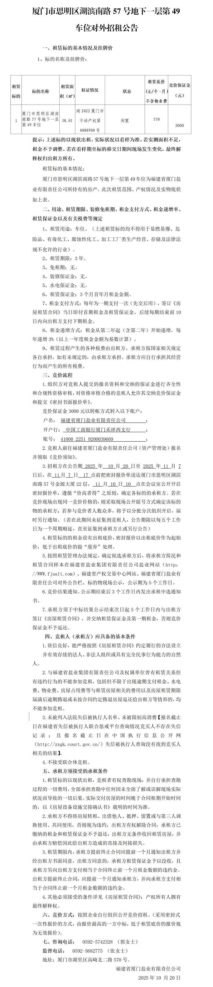 廈門市思明區(qū)湖濱南路57號地下一層第49車位對外招租公告