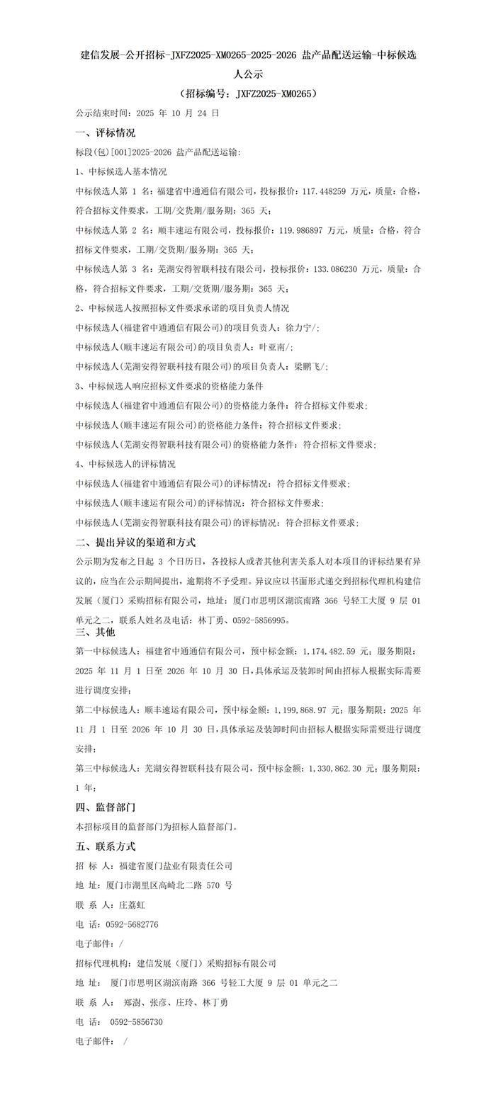 福建省廈門鹽業(yè)有限責(zé)任公司2025-2026鹽產(chǎn)品配送運(yùn)輸中標(biāo)候選人公示