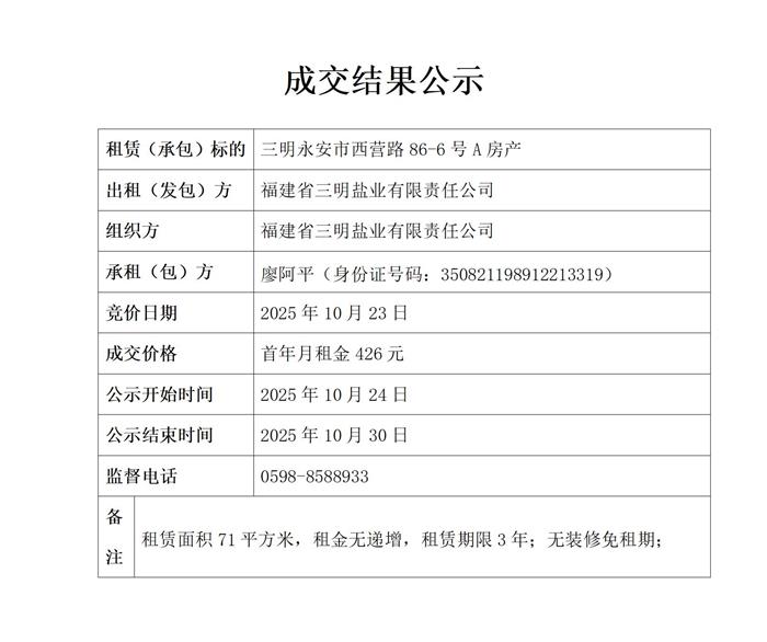 三明永安市西營路86-6號A房產(chǎn)出租競價結(jié)果公示