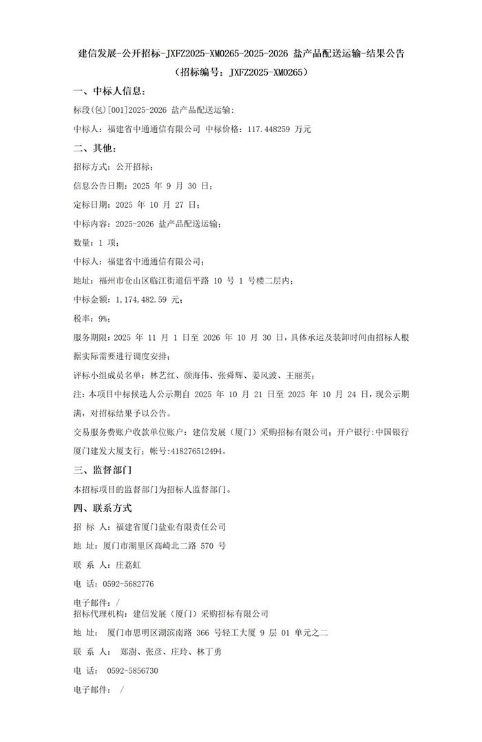 福建省廈門鹽業(yè)有限責任公司2025-2026鹽產(chǎn)品配送運輸結(jié)果公告
