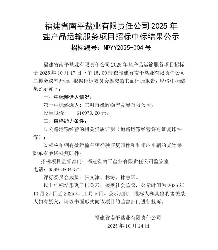 福建省南平鹽業(yè)有限責(zé)任公司2025年鹽產(chǎn)品運(yùn)輸服務(wù)項(xiàng)目招標(biāo)中標(biāo)結(jié)果公示