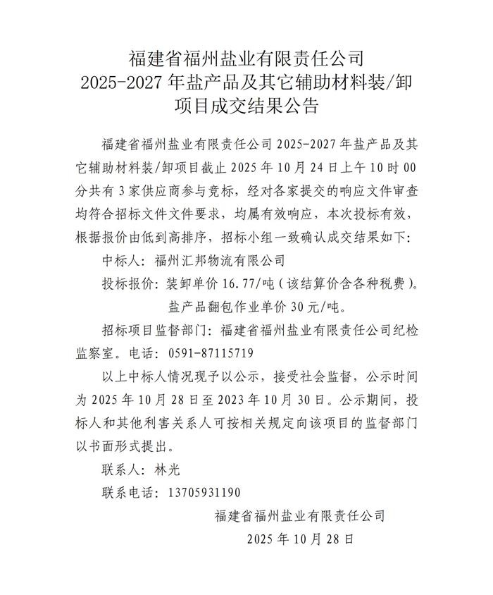 福州鹽業(yè)2025-2027年鹽產(chǎn)品及其它輔助材料裝卸項目成交結(jié)果公示