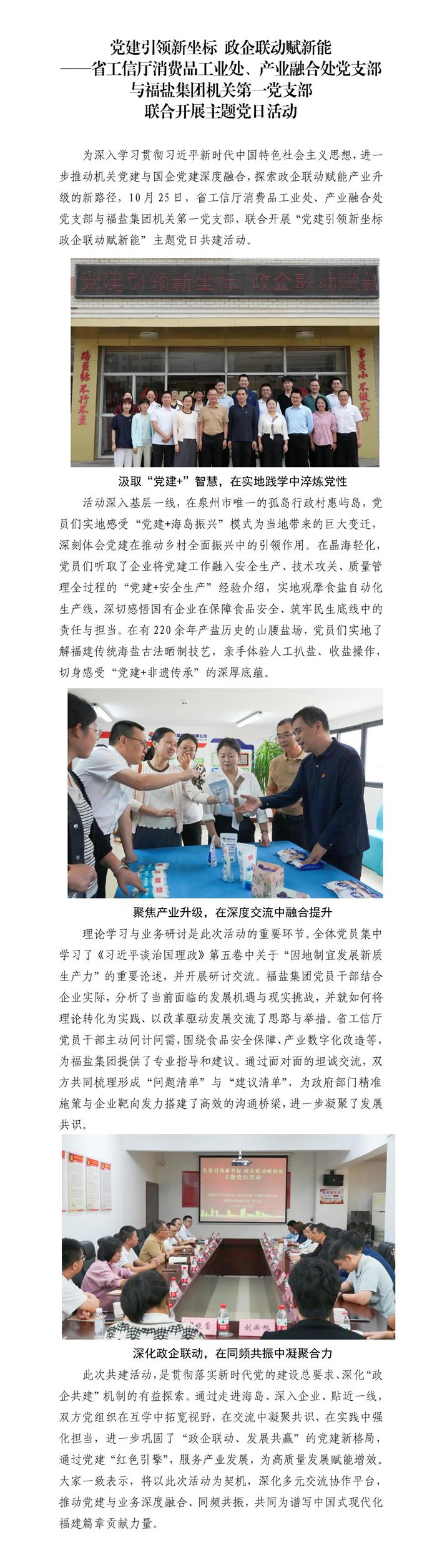 省工信廳消費品工業(yè)處 產(chǎn)業(yè)融合處黨支部與福鹽集團(tuán)機關(guān)第一黨支部聯(lián)合開展主題黨日活動