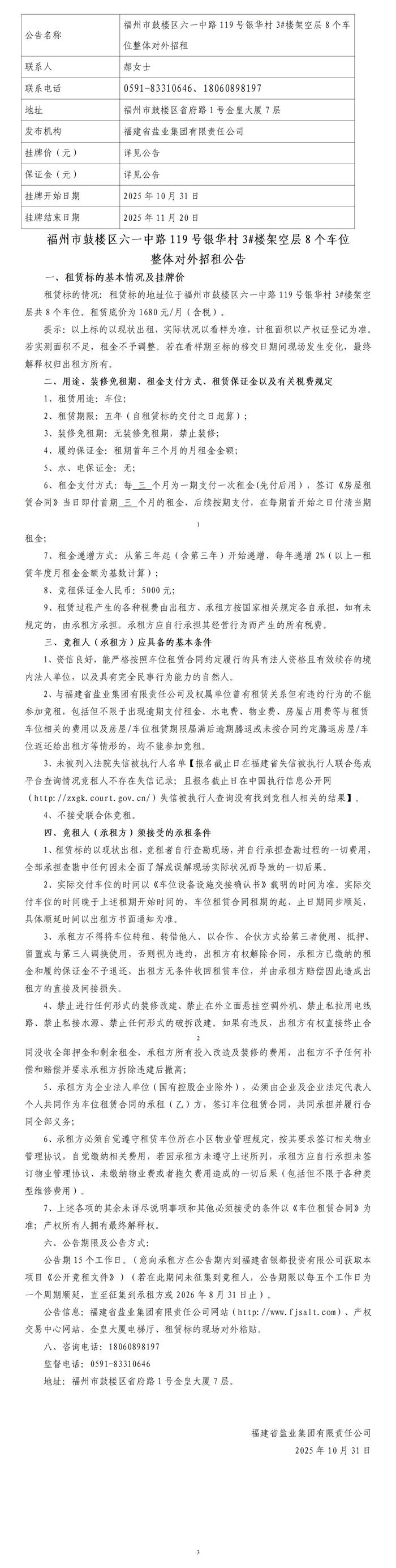 福州市鼓樓區(qū)六一中路119號(hào)銀華村3#樓架空層8個(gè)車位整體對(duì)外招租公告
