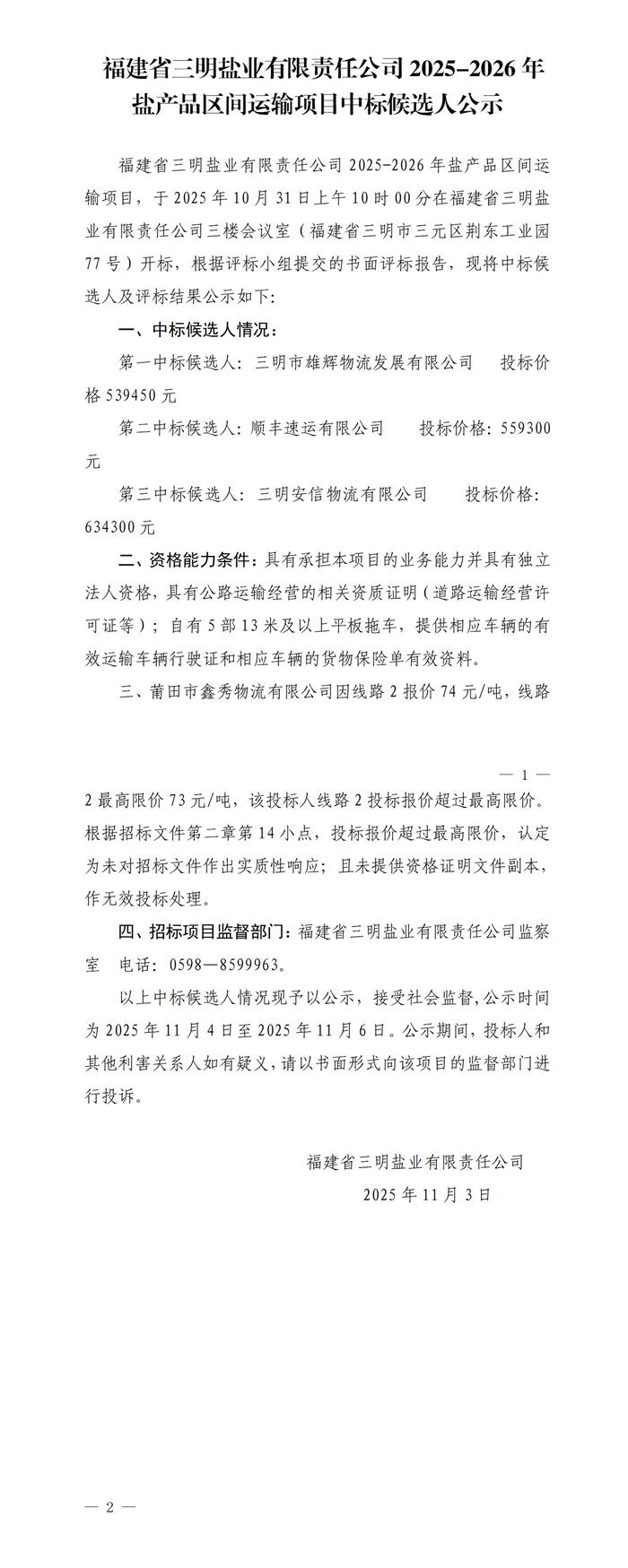 福建省三明鹽業(yè)有限責(zé)任公司2026-2027年鹽產(chǎn)品區(qū)間運(yùn)輸項(xiàng)目中標(biāo)候選人公示